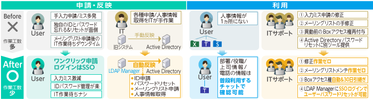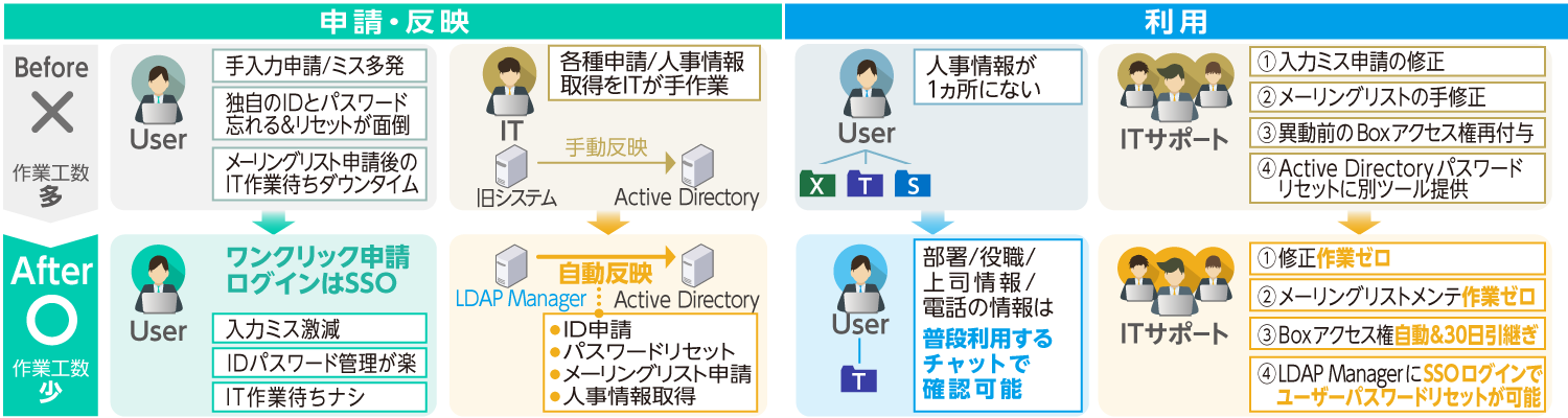 三つ目にITサポート業務での観点です。旧ID管理システムでは、申請後の修正やメーリングリストの手修正、異動前のBoxアクセス権の再付与など、ITサポートが多くの作業を行っていました。しかし、LDAP Managerの導入で、申請の入力ミスが減り、修正作業やメーリングリストのメンテナンス作業がほぼゼロになりました。