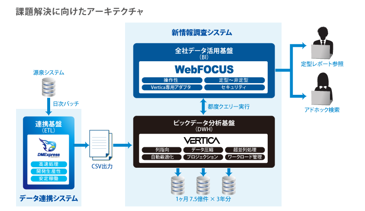 こうしてVerticaとWebFOCUSの採用を正式に決めた同社は、2018年4月に新たな情報調査システムの構築作業をスタートしました。基幹システムをはじめとする様々な業務システムのデータベースから、データ処理基盤 DMExpressを使ってデータを抽出・加工し、データをファイルとして作成。そのファイルをVerticaにロードする構成をとりました。