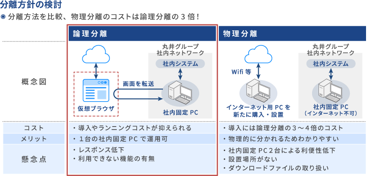 まず物理分離と論理分離を比較したところ、物理分離のコストは3~4倍も高いことが判明しました。また、いくつかの部署にヒアリングしたところ、インターネット接続用のPCを追加で設置するスペースが無いことが分かり、コスト面と利便性の面で課題があることがわかり、論理分離方式で検討することにしました。