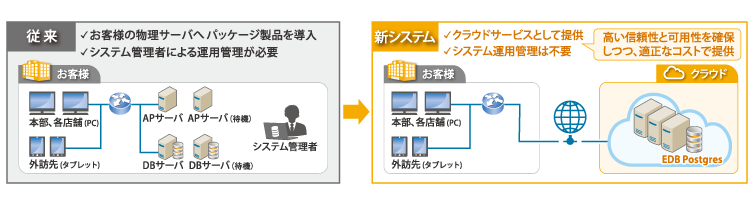 NTTデータエービックでは、自社パッケージ製品のクラウドサービス化を契機に、ソフトウェアライセンスコストの削減を目的として基盤となるデータベースをEDB Postgres へ切り替えました。それにより、サービス利用者に対して、コスト、信頼性、機能性、利便性などあらゆる面で高い付加価値を提供できるようになりました。 |