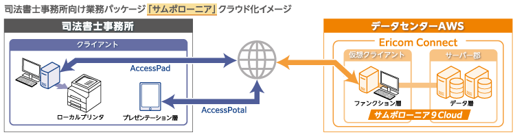 クライアント端末にはEricom Connectのクライアントソフトウェア「AccessPad」「AccessPortal」を導入し、AWS上で稼働するEricom Connectサーバーからサムポローニアの画面データのみを受け取って、PCやタブレット端末上に表示させる仕組みになっています。