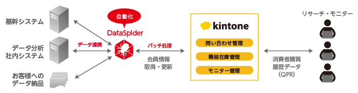 QPRの問い合わせ管理システムとして導入したkintoneがきっかけで、検討を始めました。弊社では、モニターからの問い合わせ対応などをデータ化しています。例えば、モニターデータ収集機器の使い方に関する問い合わせ、データ収集活動の休止や再開といった会員ステータスの変更などです。元々そのデータはExcelを使って管理していました。しかし、処理するデータ量が限界に近づき、システム化が必要となったのです。基幹システム内での構築ではなく、管理システムを簡易に作れるkintoneを導入しました。そこで、基幹システムとデータ連携できる「つなぐ」ツールが必要になったのです。