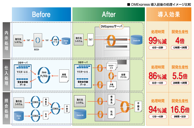 例えば、JavaとPL/SQLを使って28時間かけて開発した、ある仕入れ処理プ ログラムは80万件のデータを処理するのに65分を要しました 。それが 、 DMExpressを使うと開発時間は5時間に、処理スピードは10分に短縮されました。つまり、開発生産性は5倍以上、処理性能も6倍以上に向上したのです。