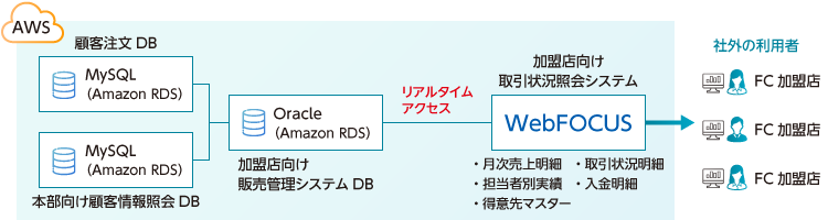 - 2008年から社外のフランチャイズ加盟店向けに、取引状況や販売状況を可視化しデータ提供する仕組みをWebFOCUSにて提供