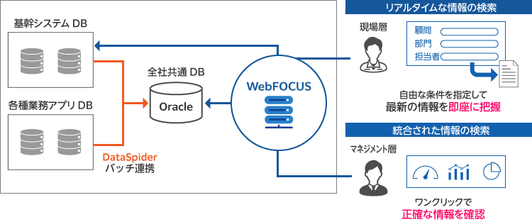 基幹システム以外のデータも統合的に活用できるように、WebFOCUSから全社共通データベースも検索しています。全社共通データベースには業務アプリから日々インプットされるデータをDataSpiderで連携しています。
