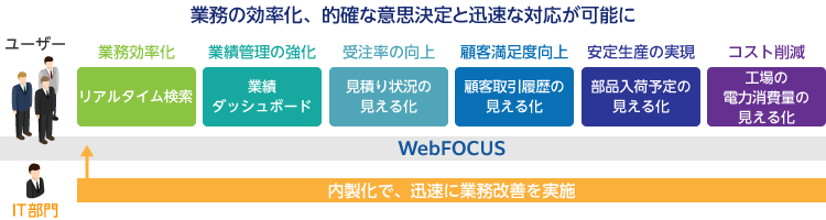 WebFOCUSは、社内外のユーザに情報を届け、情報活用を定着させるBIプラットフォームです。現場のビジネスユーザから経営者、顧客やパートナーまで、あらゆる人がいつでも、どこでも、必要な情報をリアルタイムに活用できる“オペレーショナルBI”をベースコンセプトに、ユーザが“使いやすい”情報活用環境を実現します。