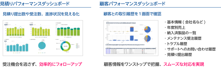 - 業績管理、営業活動、生産業務などで利用する様々なレポートやダッシュボードを提供