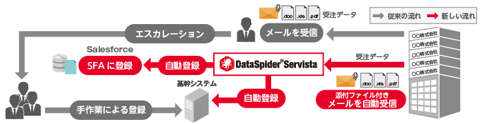- Salesforce.comなど関連システムにDataSpiderを利用して受注データを登録することで、手作業で行っていた受注処理の自動化を実現。受注予定データの取り込みなど、作業時間の削減や在庫の適正化といった業務の自動化/効率化にも活用されている。