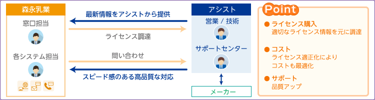 老舗乳製品メーカーとして知られる森永乳業株式会社。同社は多くのシステムでデータ転送にHULFTを標準的に利用していました。しかし、システム構築の都度にベンダーを選定し契約していたため、ライセンス管理や保守契約先がバラバラになっていました。そこで、HULFT の総合的なパートナー企業としてアシストを選定し、ライセンスと保守締結先の一元化を実現しました。 |