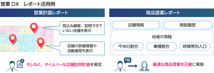 他にも、各店舗に合わせた商品提案が行えるよう、過去の商談履歴や店舗情報、各地域の年齢別や時間帯別の人口などの情報を確認できるレポートも作成しています。