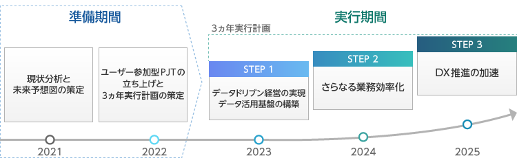 2023年のステップ1ではデータ活用基盤を構築してデータドリブン経営を推進します。その後、ステップ2ではITを活用した業務効率化やAIの活用の検討を行い、ステップ3でDX推進を加速していきます。