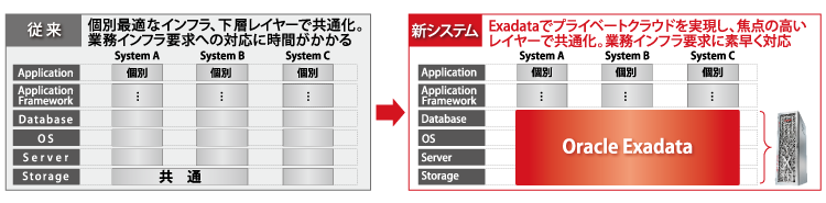 (以下、Oracle Exadata)を導入。社内に散在していた約80ものデータベースをOracle Exadata上に集約したことで、コスト削減と安定運用、ITガバナンス強化を同時に実現しました。 |