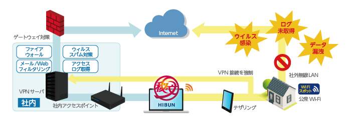 - シンクライアント専用機以外のPCに無線LAN制御機能を持つ「秘文」を全台導入し、社内利用/社外利用に関わらず、外部Wi-Fi接続時には、VPN経由でのインターネット接続のみ許可し、必ず社内と同等のセキュリティレベルが確保できるように設定を行った
