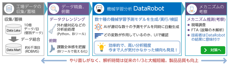 - データの抽出、クレンジング、DataRobotによる解析で、従来の3分の1の時間で、10倍高い精度の分析を実行できるスキームを確立