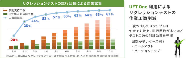 UFT One導入時もスクリプト開発工数が必要となりますが、ロールアウトやバージョンアップなどを複数回実施する場合、試行回数が増えるほど削減効果が得られます。例えば、試行回数が10回程度必要な場合は、手動時のテストの工数と比較し67%の工数を削減できる想定です。