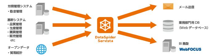 DataSpider Servista(以下、DataSpider)は、異なるシステムのデータやアプリケーションをノンプログラミングで「つくらずにつなぐ」データ連携(EAI)ツールです。アイコンを使用した簡単開発、充実した運用管理機能で連携処理の自動化を実現。DataSpiderなら、開発生産性の向上と運用コストの低減を図れます。