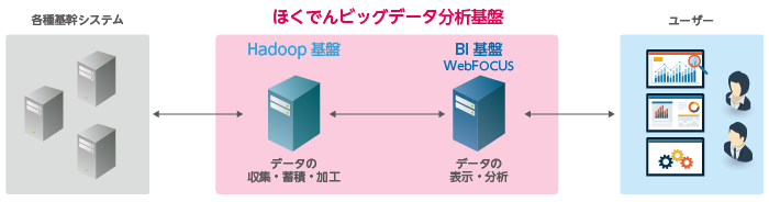 データを高速に処理しながら一元管理できる「Hadoop基盤」と、Hadoopに蓄積されたデータの可視化や分析を行うための「BI基盤」を掛け合わせたものが「ビッグデータ分析基盤」として望ましいと考えました。