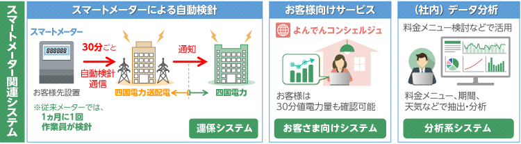 電気使用状況のお知らせやポイントサービスを提供している「よんでんコンシェルジュ」では、スマートメーターが設置されているお客様は、節電の指標としても役立てて頂ける30分値電力量の確認も可能です。また、社内でも料金メニューの検討などで、このデータが活用されています。
