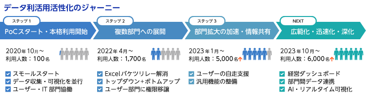 同社では、Qlik Senseを展開する計画を「データ利活用活性化のジャーニー」として、4段階のステップに分けて活動していきました。ステップ1は2020年10月に、データ活用に意欲的な部門から選抜した100名によるスモールスタートで開始し、これをPoCと位置付けました。また、ビジネス部門と情シス部門による協働により、データの蓄積と活用を同時にスタートし「結果をすぐに出す」ことに注力しました。