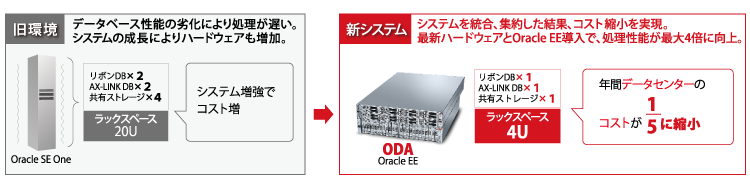 (以下、ODA)を新たに導入。データベース性能が大幅に向上したとともに、運用コストや保守コストの削減や、優れた監視ツールの活用による安定稼働も同時に実現しました。 |