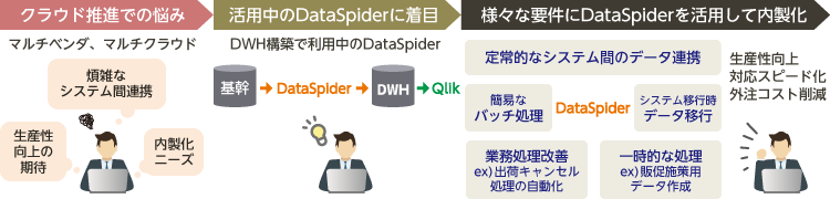 導入から10年の間でデータベースの再構築、名寄せシステムの追加、データ活用環境をQlikに統合するなど、数回にわたりシステム基盤の変更がありましたが、DataSpiderは変わらず活用され続けてきました。長年活用してきた経験が、データ連携の課題に対する解決策のヒントになったと言います。