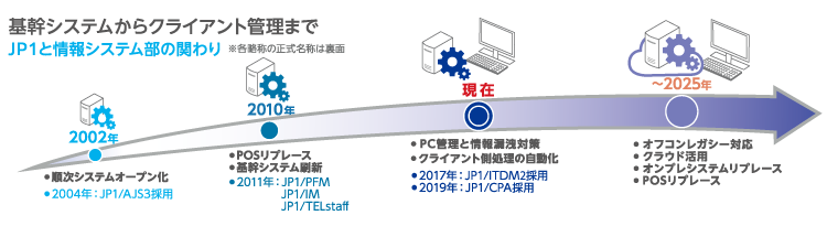こうしてJP1のジョブ管理製品「JP1/Automatic Job Management System 3」をアシストから導入したスガキコシステムズは、その後の大規模なシステム刷新の際にもJP1のシステム監視製品を導入。更に、クライアントPCのデバイス制御も実現できるIT資産管理ツール「JP1/IT Desktop Management2」や、クライアント上で実行している帳票処理や分析データ処理を管理するための「JP1/Client Process Automation」など、新製品も積極的に取り入れ、基幹システムからクライアント管理まで、幅広いJP1製品による盤石な運用管理体制を構築しました。