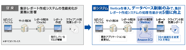 日本最大級のアルバイト情報サイト「バイトル」を運営するディップ株式会社では、近年のビジネス急成長に伴う掲載求人広告数や従業員数の急増により、広告効果集計レポートを作成するシステムの負荷増大と性能劣化に悩まされていました。そこで、Amazon Elastic Compute Cloud(以下、Amazon EC2)のクラウドコンピューティング基盤と列指向型データベース「Vertica