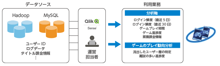 - 運営部門の担当者がQlik Senseの画面を見て、ゲームの運用状況を分析