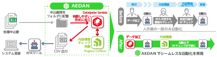 その中でアシストの提案は、スモールスタートが可能で導入しやすく、内容も私たちの課題にとてもマッチしている印象でした。「Progress Corticon」と「DataSpider Servista」を組み合わせたAEDANを導入済みのRPAツールと連動させることで、現行業務に影響を及ぼすことなく、従来ロボット化が困難だった複雑な判断を自動化できます。そのため業務の引き継ぎが難しかったベテランの経験に頼った業務も、属人化をなくすことが期待できました。