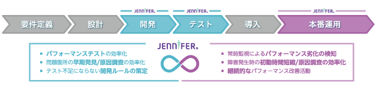 同社の取り組みで何といっても特筆すべきは、2015年6月からの利用開始の際、まず開発環境からJENNIFERを導入し、本番環境とともに開発環境でも活用し続けることを最初から決定していたことです。理由は二つありました。一つは、JENNIFERの動作や機能を見極めるには、開発環境がより適切であったためです。もう一つは、本番ではなく開発時から実施した方がより低いコストでパフォーマンス改善が図れるからです。システム開発における「1:10:100の法則」、本番環境で見つかった問題解決コストが100とすると、開発時では10、設計時には1で済むことを同社は熟知しています。