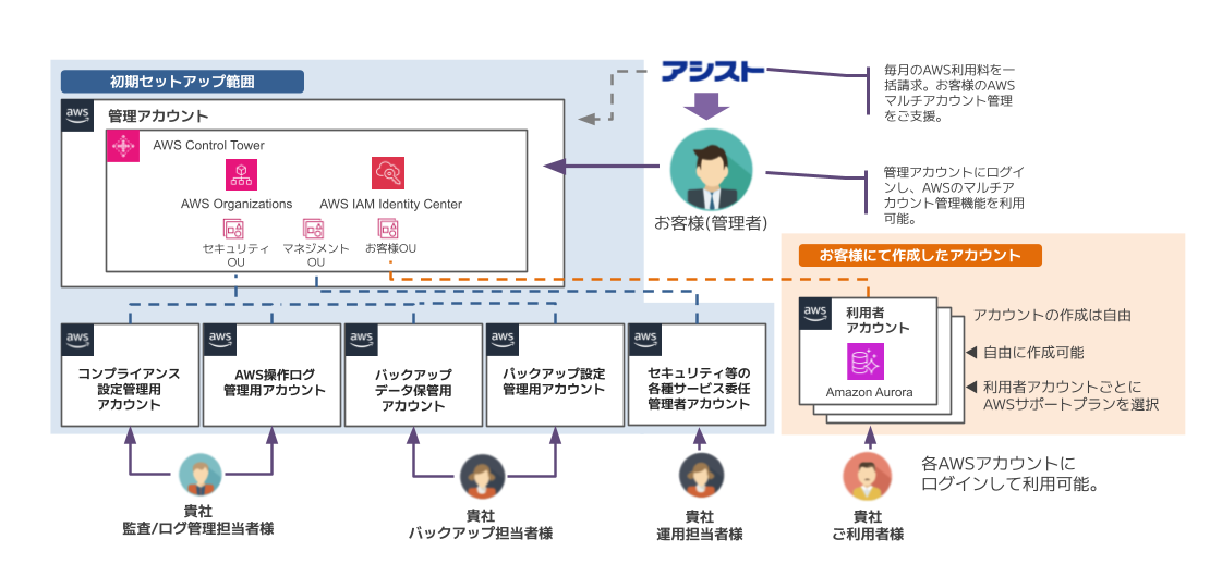 アシストでは、こうした課題を解決し、お客様が安心してマルチアカウント環境を使いこなせるよう、2つのサービスをご用意しました。