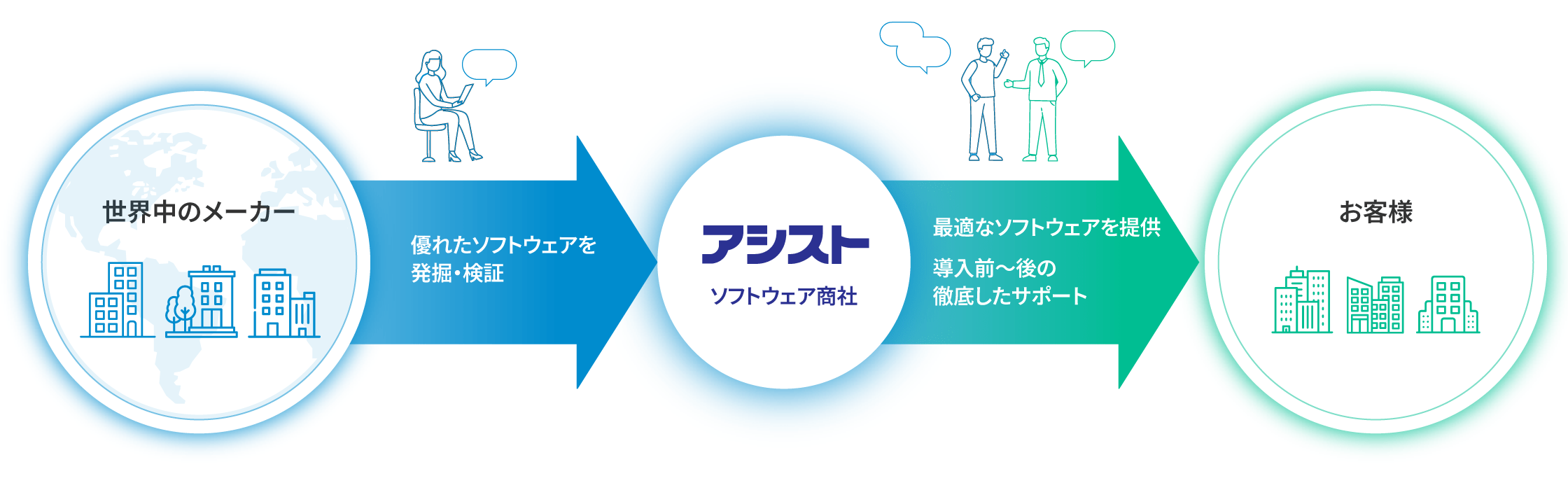 あらゆるお客様の課題を解決する為、国や地域を問わず、最適なソフトウェアを日々発掘・検証しています。当社の基準に適合したソフトウェアのみ、お客様に提案しています。