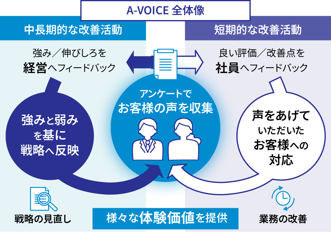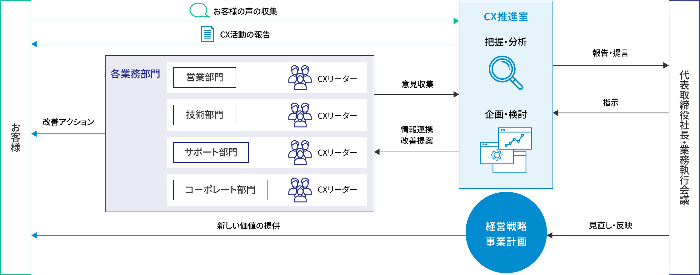 全社のCX意識向上に向け、CX推進室の設置に加え、各業務部門にCXリーダーを配置しております。CX推進室では、お客様からいただいたお声をCXリーダーと連携しながら日々の改善アクションに役立てております。また、お客様の声の分析結果を定期的に業務執行会議へ報告することで、会社レベルで取り組むべき課題については、経営戦略や事業計画に反映しております。