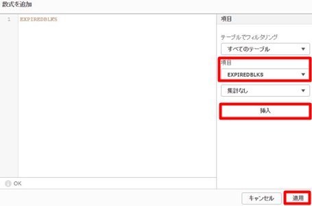 4.「メジャー」から「数式エディタを開く」を選択し、"EXPIREDBLKS"を「集計なし」で挿入