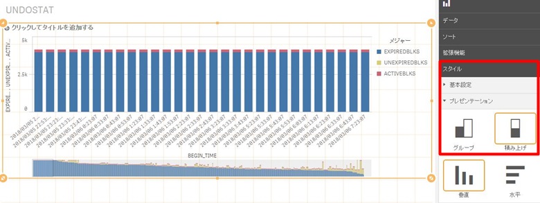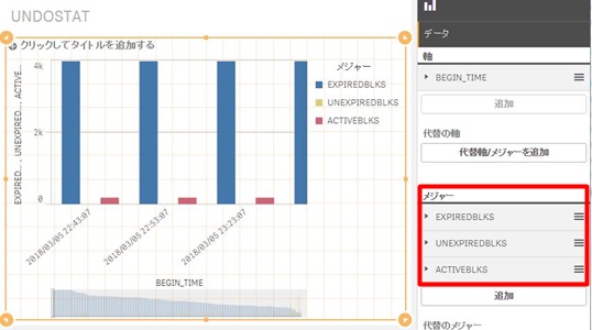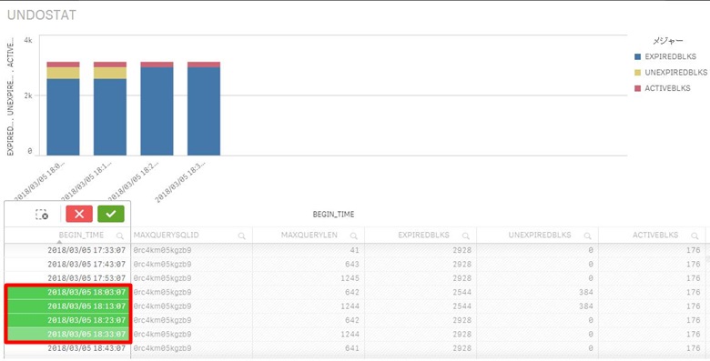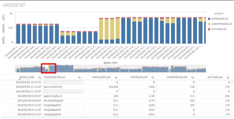 作成したグラフを使い、UNDOの使用状況を確認します。BEGIN_TIMEでソートし、グラフの下にあるバーを移動させることで、時間帯ごとのUNDO使用量の推移を見ることができます。