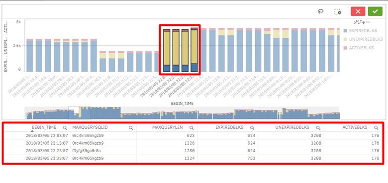 ターミナルに出力されたSELECT結果からACTIVEBLKSやUNEXPIREDBLKSが多い時間帯を目視で確認するのは苦労しますが、グラフ化することで直感的に確認可能です。また、グラフや表で確認したい時間帯をクリックすることでその時間帯のデータのみフォーカスして見ることも可能です。