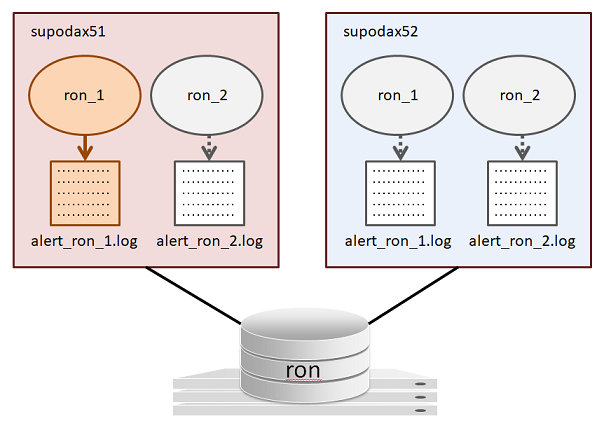 各インスタンス(「ron_1」/「ron_2」)が両方のノードで起動するため、「alert_ron_1.log」/「alert_ron_2.log」が両方のノードで作成され、合計4つのアラートログが存在します。
