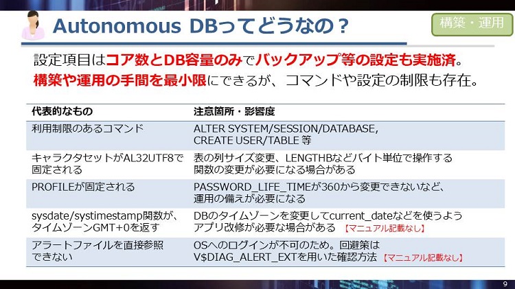 データベース側で多くのことを実現してくれる一方で、ユーザ側で実行できるコマンドや設定には制限が存在します。採用を検討する上ではAutonomous Databaseの特徴を理解しておく必要があります。