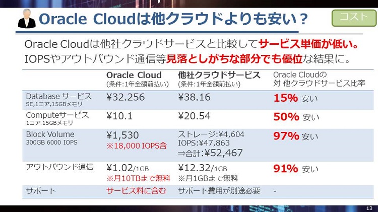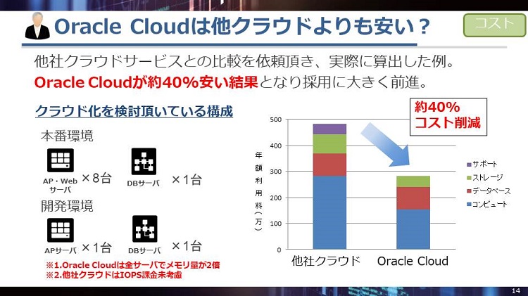 データベース部分は他社クラウドと大きく変わりはありませんが、コンピュートやストレージ、サポート費用で大きく値段に差がつき、Oracle Cloudの方が40%ほどコストメリットがあるという結果が出ています。