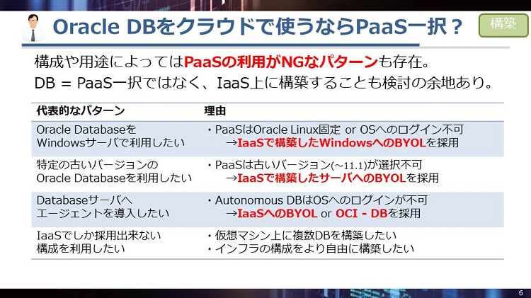 他にも、”現行環境の監視ツールを移行先でも利用したい”という場合は、Autonomous Databaseはエージェント導入作業に必要なOSへのログインができないため、IaaS、もしくはPaaSの中でもOSへのログインが可能なOCI-Databaseを検討します。