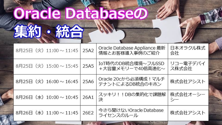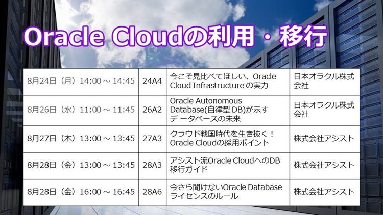 既存Oracle Database環境の集約・統合については、Oracle Database Appliance、Oracle Exadata Database Machineのセッションを中心にご視聴ください。