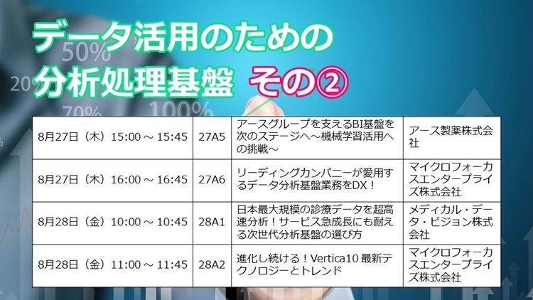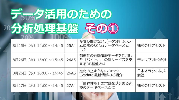 データドリブン経営が進む中、Vertica、Oracle Exadata Database Machineを利用して、データを活用する基盤をどのように作り運用しているのか。多数のセッションをご用意していますのでぜひご視聴ください。