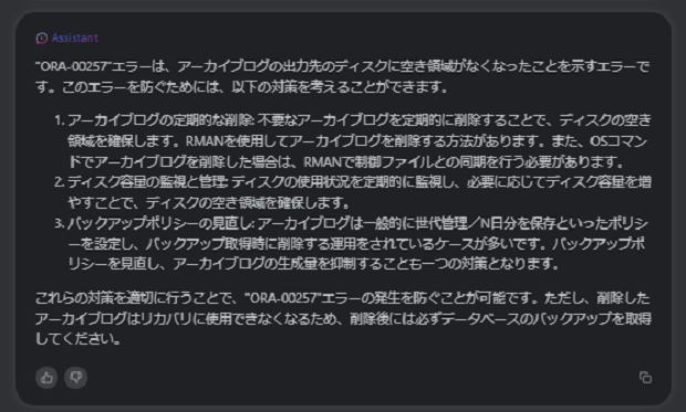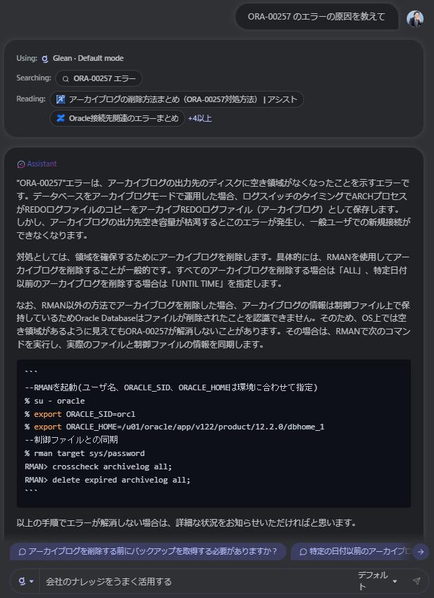 通常であればここで「アーカイブ先がディスクフルになるとORA-00257で接続できなくなる」「RMANで削除することで解消する」という知識がついて終わりですが、生成された回答の下部には追加質問が並んでいます。