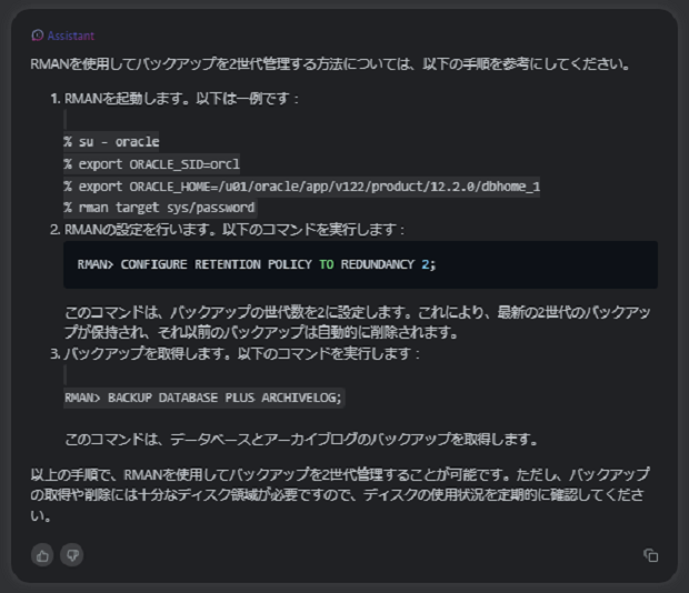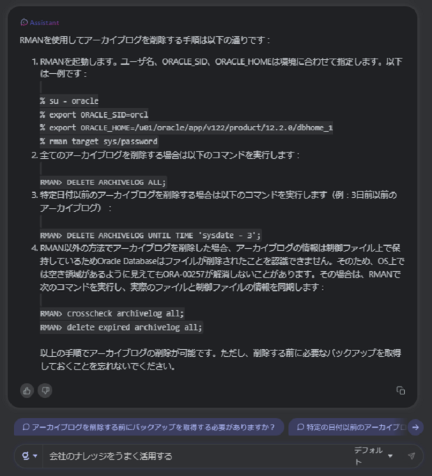 削除コマンドではなくcrosscheck/delete expiredのコマンドが先に表示されるあたりはお茶目に感じますが(追加質問のクリックで削除手順も作ってくれましたが)、初動でお客様にお伝えする情報としては十分な結果のように見えるので、この結果を元に従来の対応よりも早くお客様向けの回答文を作ることはできそうです。