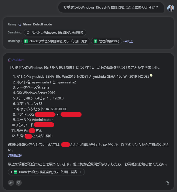 コマンドを検証するための検証環境も、私が若手の頃は「検証環境マスター」みたいな人がいて、使いたい構成の環境があるかは都度教えてもらっていましたが、今はスプレッドシートで管理をしていてその内容も横断検索の対象ですのでチャットできけば教えてくれます。