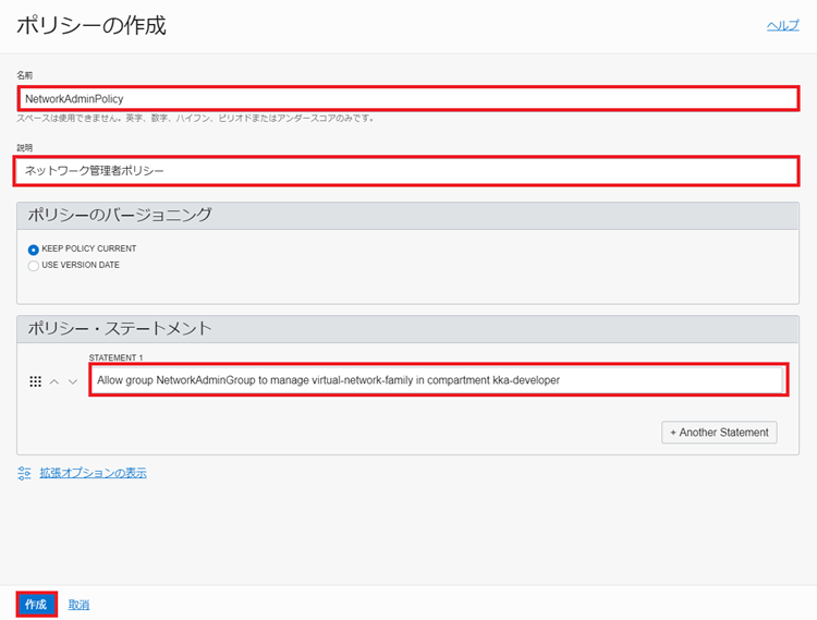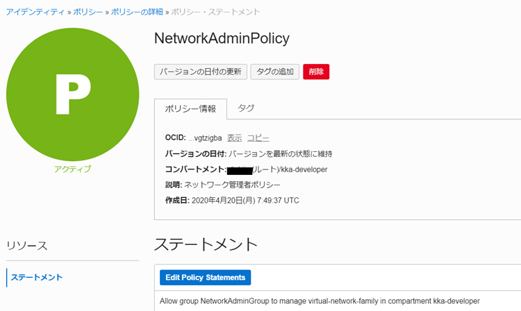 コンパートメント「kka-developer」を選択し、[ポリシーの作成]をクリックします。