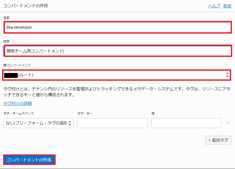必要な項目を入力して、[コンパートメントの作成]をクリックします。