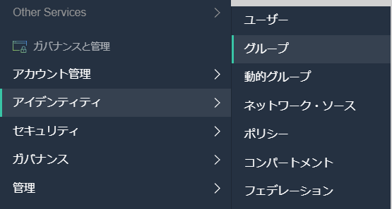 5.コンソールメニューから、[アイデンティティ]→[グループ]をクリックし、作成した