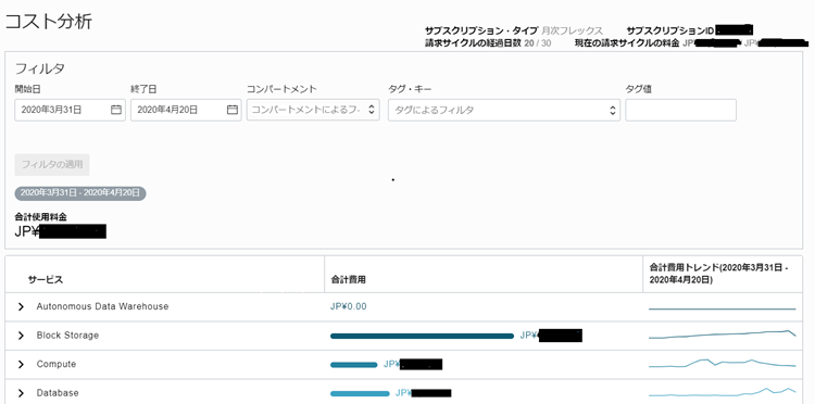 OCIのコンソールメニューには、『どの期間』『どのコンパートメントで』『どのサービスが』『どれくらいの料金を』使用していたか確認する機能があります。