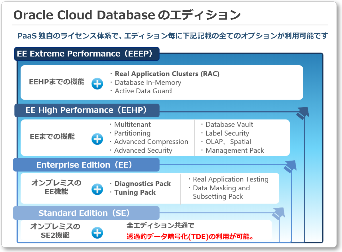 オンプレ環境でOracle Databaseのエディションを決める場合には、Standard Edition 2(SE2)とEnterprise Edition(EE)の二つをベースに、EEに有償オプションを加えることで構成を決めていました。Oracle Cloudでは有償オプションの考え方がなく、各エディションにそれぞれ有償オプションが含まれる形態で、計四つのエディションが提供されており、要件や使いたい機能に合わせて選択する形です。